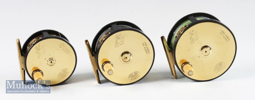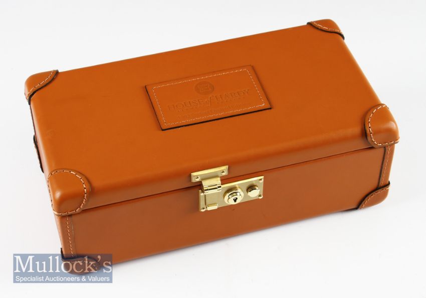 Fine Commemorative Set of Hardy 1902 Perfect brass faced wide drum ltd ed fly reels in leather presentation case No.038/250 – comprising 2 5/8”, 3” and 3.25” dia – all stamped with makers Rod in Hand, Bordered Oval and Straight Line logos, in custom fitted leather reel case with oval descriptions to each section – one fitted with 1912 Perfect 4” description instead of 1902 2 5/8” – comes with makers ltd ed booklet – original key in leather attachment together with Hardy’s green cloth reel case cover