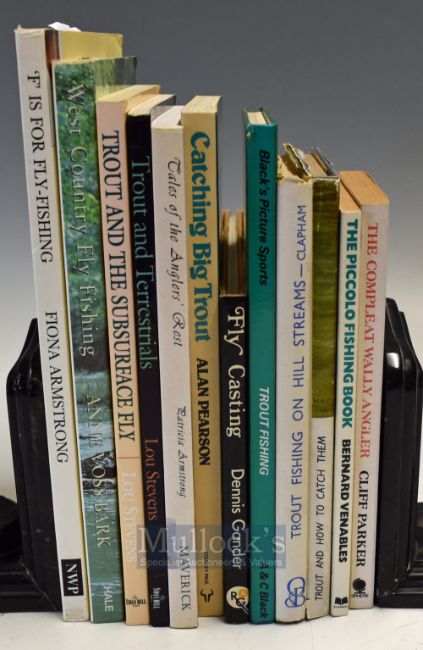 Selection of Trout Fishing Books – Covering many aspects of Fly Fishing to include F is for Fishing Fiona Armstrong, Tales from the Angler’s Rest Armstrong, West Country Fly Fishing Bark, Fly Casting Gander, The Complete Wally Angler Parker, Trout & How to Catch Them Castle, Catching Big Trout Pearson, Trout Fishing Sceats, Trout & Terrestrials Stevens, Trout & the Sub Surface Fly Stevens, The Piccolo Fishing Book Venables, Trout Fishing on Hill Streams Clapham 8 been signed copies (12)