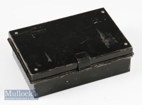Marked ‘Made in England’ black japanned bait box with hinge lid compartments, containing a selection of various lures, baits, spoons, spinners etc, some with maker’s marks, condition mixed G overall