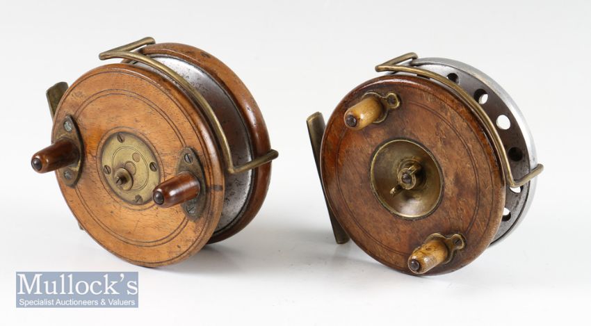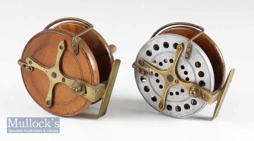 2x wooden and alloy combination wide drum centre pin reels – 4” dia with perforated alloy rear drum plate and back plate fitted with brass star back and on/off check button – bickerdyke line guide – brass dish face centre – runs freely; and 4” Nottingham reel with brass slater style spring release latch, alloy rear drum back plate, brass bickerdyke line guide, on/off check button – runs freely. (The Late John Snelson Collection)