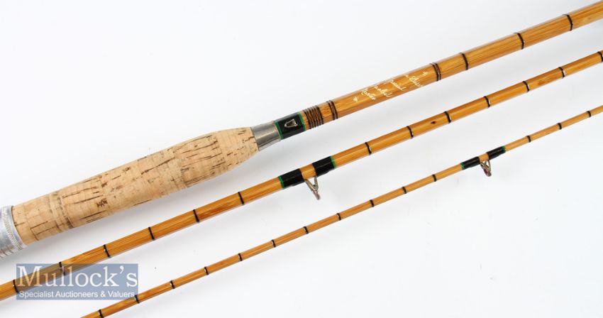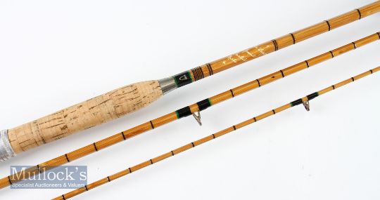 Fine John Grottick Style “The Super Special Barbel Master” split cane rod – 10ft 9in 3pc with red Agate lined guides throughout, 23” fat cork handle with sliding alloy reel fittings, guides appears used otherwise hard to fault in MCB