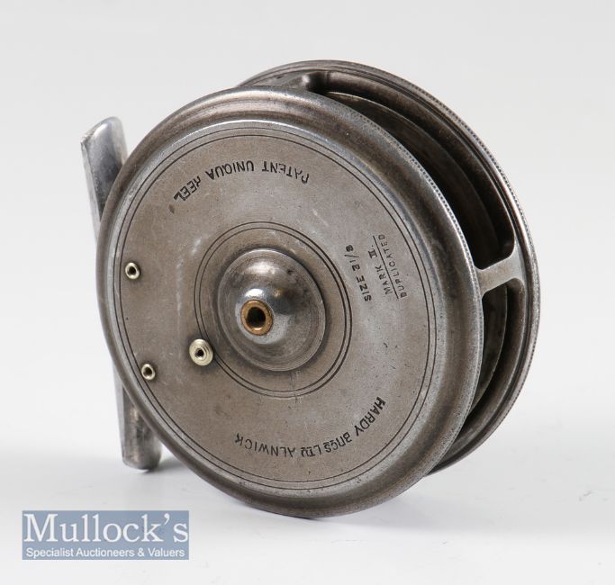 Hardy Bros Maker Alnwick “Patented Uniqua Reel” Mark II Duplicated alloy trout fly reel - 3 1/8” dia with smooth alloy foot stamped to the one end England (possibly replaced), constant check, c/w line, runs smoothly – in tartan cloth reel bag