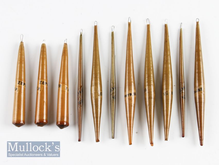 Zephyr rolled paper floats In three patterns, lengths 3" to 5" in tapered and flat top forms, all with line attachment wires, good condition (11)