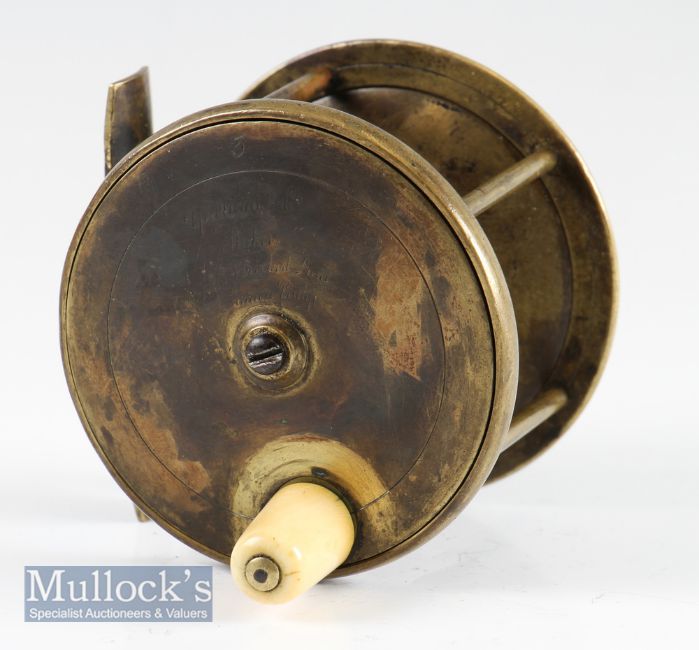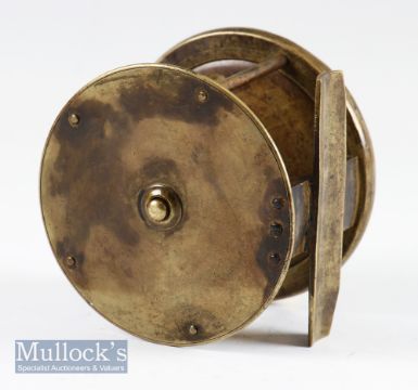 Gowland & Co Maker 3 and 4 Crooked Lane London Bridge brass extra wide salmon fly reel c.1875 – 3.5” dia x 2 3/8” wide – foot filed at both ends, No. 5 stamped to the rim - good constant check – turns smoothly. (The Late John Snelson Collection)