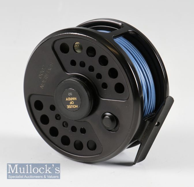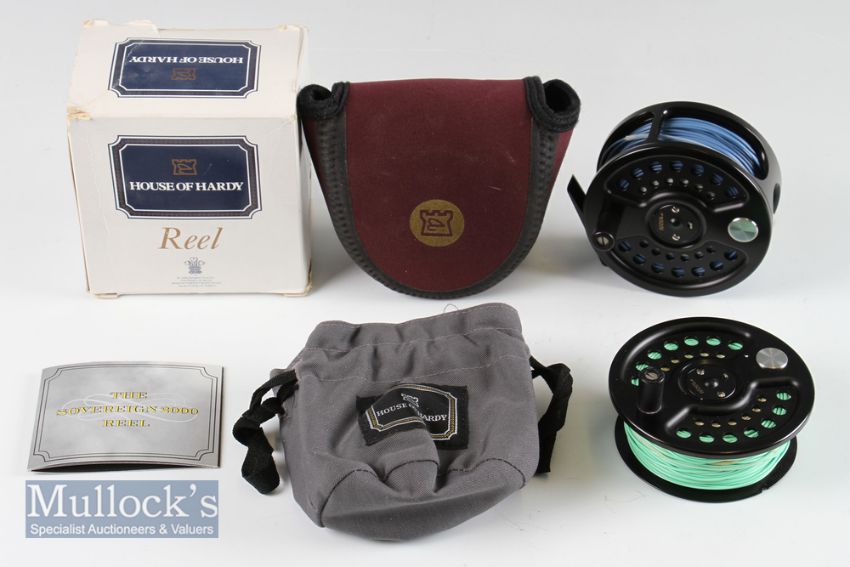 Good Hardy The Sovereign 9/10/11 Salmon fly reel c/w spare spool and lines – 4” dia black finish, backplate disc drag adjuster, fitted with Carron Int.S fly line – in maker’s neoprene reel pouch together with spare spool c/w Carron fly line in makers cloth pokey bag – appear unused