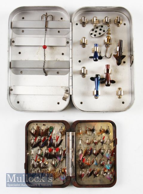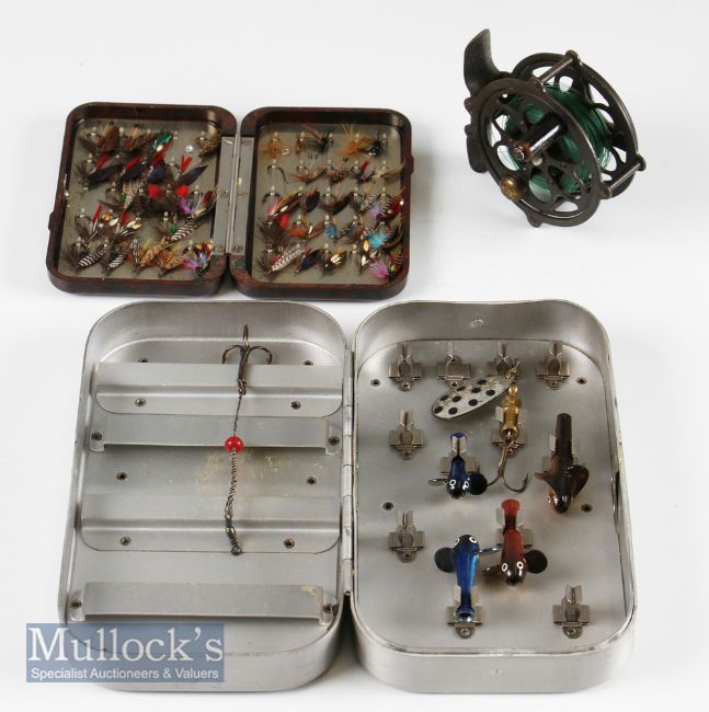 Hardy Neroda fly case: Metal lined with hook complete with a selection of 40 various traditional flies 3.75” x 2.5” together with alloy wheatley hook and bait box 6” x 3.5” and a 2.5” skeleton design fishing reel (3)