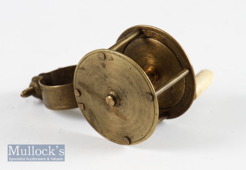 Scarce small brass collar winch fly reel - 1.75” dia, with tiny curved crank arm fitted with bone handle, brass collar winch comes with the original Y shaped locking screw, one pin missing to the collar bridge, devoid of check hence slightly catches - retaining most of the original lacquered finish6.