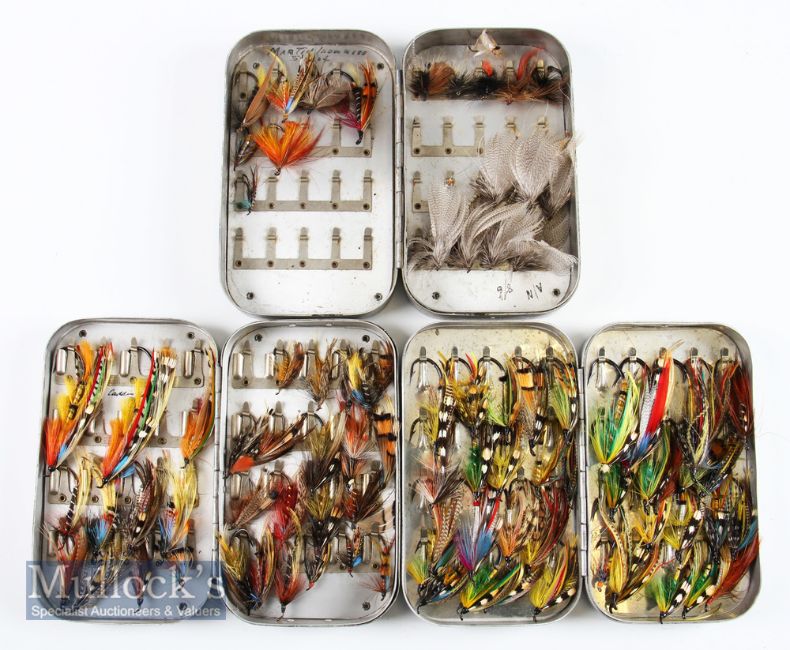 2x early Wheatley alloy fly cases one containing Hardy holdfast clips containing dressed flies, another very early Wheatley alloy fly case containing dressed flies