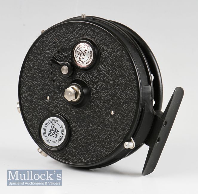 Grice and Young “Avon Royal Supreme III” centre pin trotting/float reel – 4 3/8” dia - on off check, quick drum release latch, complete with reversible line guide black mottled finish appears unused in the original makers box with leaflet
