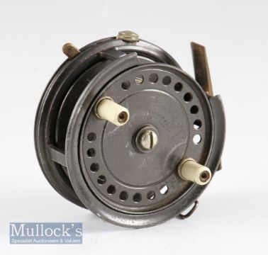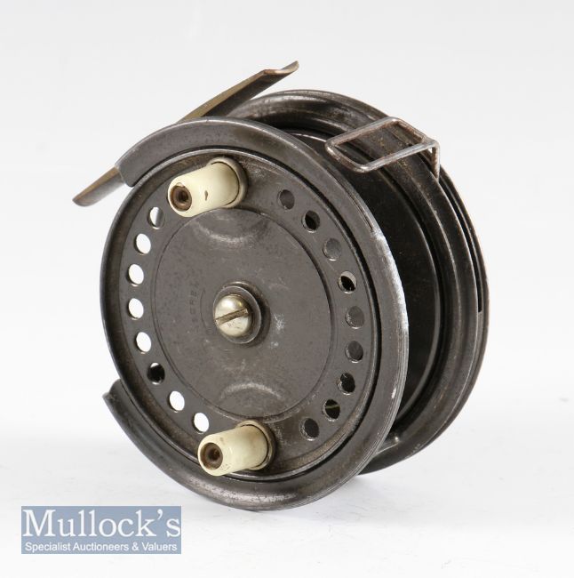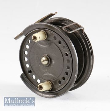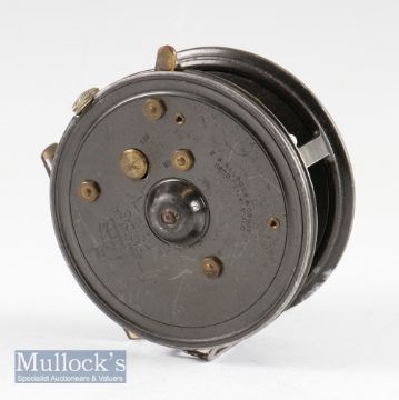 Interesting Allcock “Easicast” alloy casting reel - 3.5”dia with factory quarter rim cut out, brass foot tiny knock to one end, complete with 3 rim controls, retaining much of the original dark lacquered finish and turns freely c/w suede pokey bag