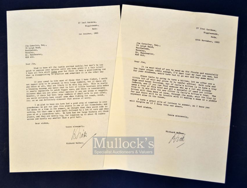 Richard Walker letters 1983 (2) – 1st October and 10th November typed and hand signed Dick – the first letter showing his pleasure that all the tackle had arrived safely and not to rush in with the opinion until he’d given it a fair trial… Quote I know all this stuff looks good but is many good looking rod that is disappointing in practice and sometimes it is the other way round”. Walker then goes on to discuss canal fishing and in his experience ….. “I would not expect eels to be present in very large numbers but if there are any there at all, they are likely to be very big ones. This is really a blessing because any water that is full of little boot lace eels makes it nearly impossible to catch bigger ones, and there is considerable nuisance when you are after at the species if you use worms or maggots. However if there had been large numbers of small eels in your canal, you would certainly have caught some when fishing for a Roach, Tench, etc.so we can definitely discount that source of worry” The final paragraph discusses good crops of tomatoes…. .“all very large and hardly any smaller than a golf ball” The second letter thanking Cloverley for the floats and the leger stops having just lost his last one which would have meant he had to go out and buy some more. Another paragraph dealing with looking after training of kittens and finally the vast amount of letters Walker still had to answer