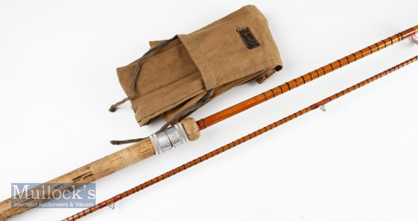 Unnamed B James & Son Mk. IV split cane carp rod – 10ft 2in 2pc with lined butt and tip guides – 27” doughnut style cork handle with alloy sliding reel rings – lightly soiled possibly refurbished devoid of all marking just above the cork handle and comes in makers cloth bag