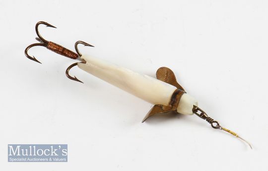 Hardy Bros Mother of Pearl Devon minnow bait - body measures 2” with copper collar and fins, fins marked by maker ‘Hardys Alnwick’, twin treble