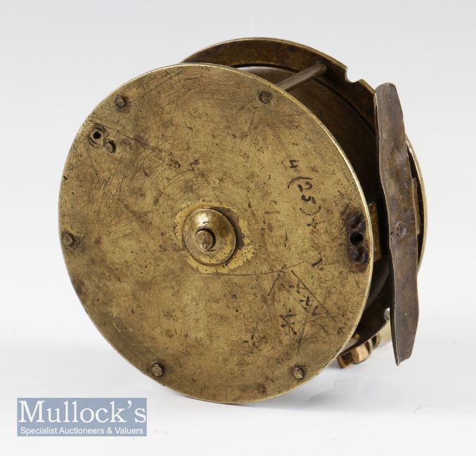 Unnamed unusual large brass folding crank wind salmon fly reel – 4.25” dia with straight arm fitted with an interesting brass folding handle with brass locking screw which retreats into the handle – together with two “u” shaped positions either side of the brass foot filed at both ends plus some knocks – arm possibly replaced