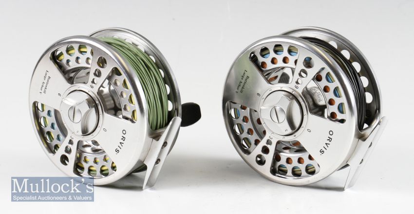 An impressive collection of 2x very good Orvis Battenkill Large Arbor V salmon fly reels and 3x spare spool c/w lines (5) – both 4.25”dia 4x with lines to incl Rio F AFS 10/11; Guideline 10/11 H13; Guideline 10/11 S135; Rio AFS Hover Line 10/11; another empty spool unused - all contained in Scierra padded reel case plus 3x Orvis hard frame makers reel pouches – the ultimate salmon fishing outfit