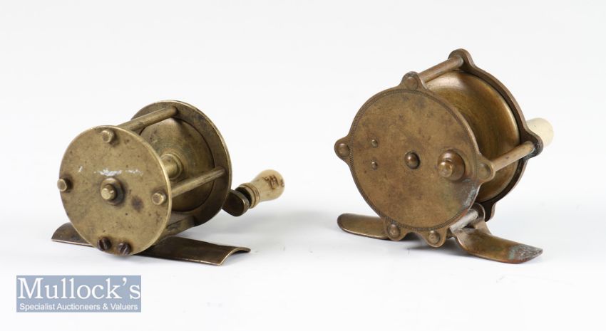 2x tiny brass crank wind reels – Vic. 1” dia x 1.26” wide drum fitted with curved crank handle with bone handle (a little bit stiff) otherwise good example; and later raised pillared 1.75” dia stamped with no. 40 to the foot c/w counter balance crank wind - good constant check
