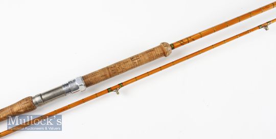 Good Hardy “The No.1 L.R.H Spinning” Palakona Rod – 9ft 6in 2pc with clear Agate lined butt guide with 2x red and 4x clear agate guides to tip - 29” mushroom style cork handle with full makers alloy reel seat with screw locking fittings & ser. no stamped to the butt E59260 - handle lightly soiled, some water leakage to the guide whippings otherwise very usable and presentable – cloth bag