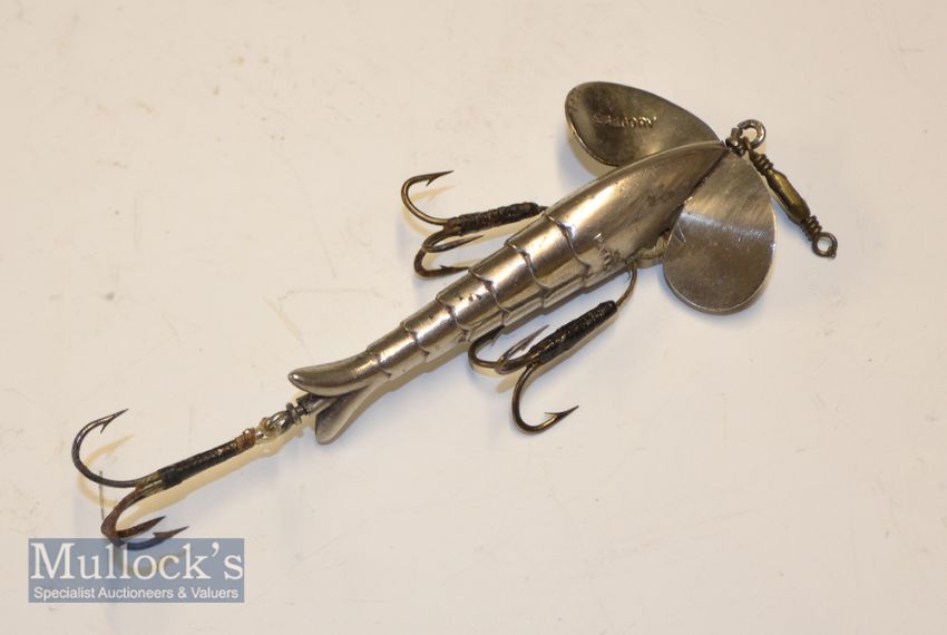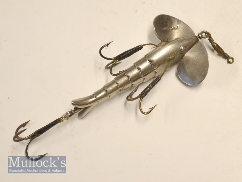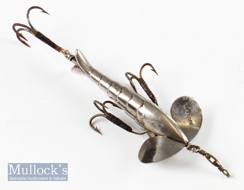 Rare Gregory Silver 2” Treble Hooked Minnow – White metal construction with triple hooks on tail and stamped Gregory stamped to the fins