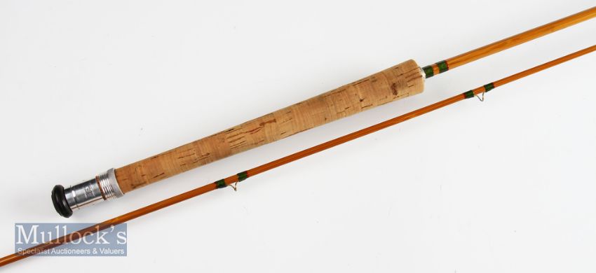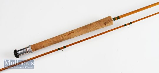 Fine Pezon et Michel Split cane trout fly rod – 8ft 6in 2pc with staggered ferrule – single sliding alloy reel ring – appears unused in J S Sharpe ltd cloth bag