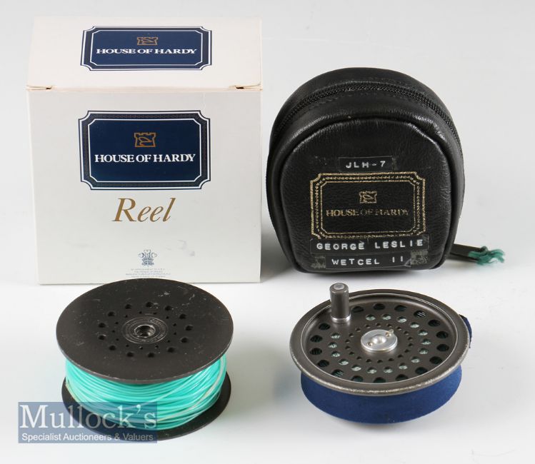 2x Hardy spare fly spools – J.H.L Ultralite Disc No.053 line 7# spare spool c/w line in makers original faux leather and sheep skin lined padded case and makers reel box; and The Perfect post war 3 3/8” wide drum spare spool c/w line Spey Wulff 10/11 line – 80ft head
