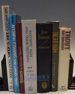 Selection of American Fly Fishing Books – Trout Bum J Gierach, Favourite Flies & their Histories M Orvis Marbury, Trout & Just Fishing R Bergman, Nymph Fishing for Larger Trout C E Brooks, Spinners S Nemes, Guide to Aquatic Trout Food D Whitlock having a long inscription and sketch from the author (7)
