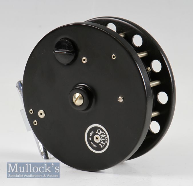 Fine and unused Allcocks Match Aerial wide drum centre pin reel – 4.5”dia chrome plated foot, backplate optional check - spins well- unused and comes in dark stained burgundy velvet lined wooden reel case