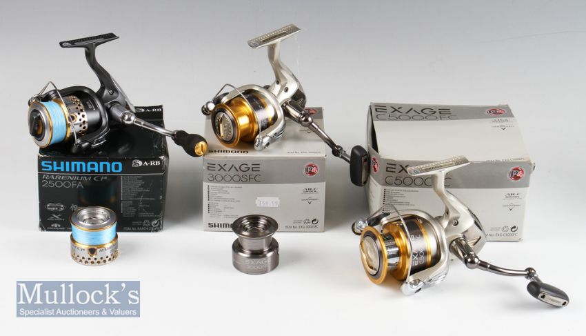 Shimano Exage C5000FC fixed spool reel – Roller bearing, varispeed together with Exage 3000SFC with spare spool and Shimano Rarenium C14 2500FA spare spool all in mob (3)
