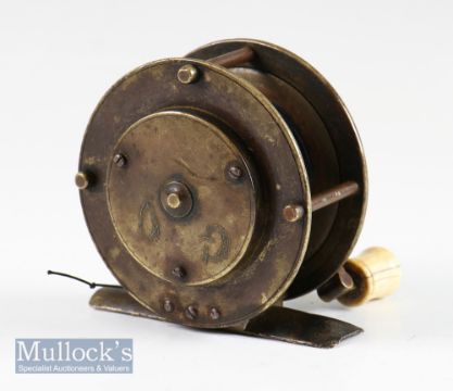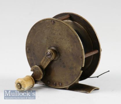 Early Vic J. Jones Maker 111 Jermyn Street London folding handle brass crank wind fly reel c.1843 - 3” dia fitted with folding crank arm with locking disc engraved with Vic. diamond stamped lozenge and also engraved to the arm “Registered 20 March 1843”; raised check housing with initials G.O neatly scratched to the back plate; good straight foot with some signs of filing at both ends; good strong check-runs freely(The \Late John Snelson Collection)