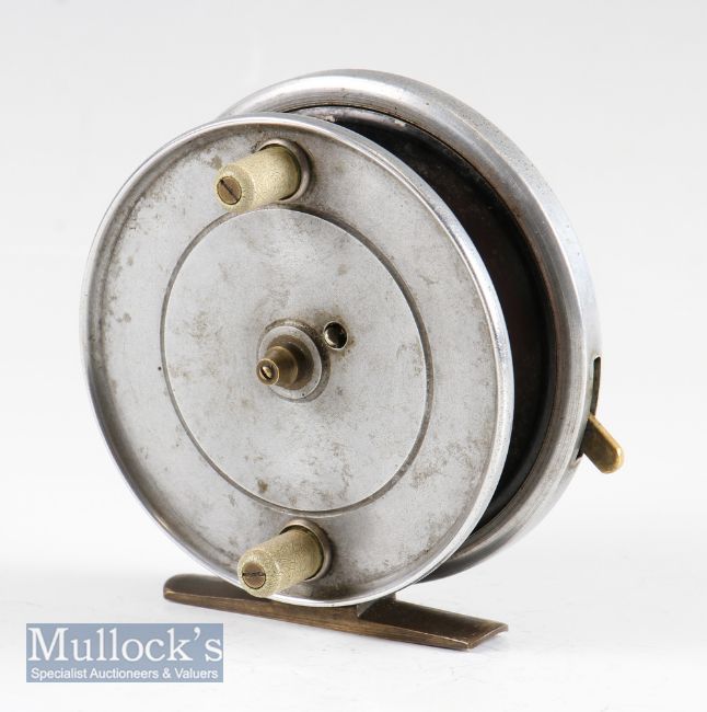 Peeks Pattern alloy centre pin reel - 3.5” dia, good straight smooth brass foot, on-off brass rim check lever, 4x spoke rear drum plate, brass bickerdyke line guide, - spins well – c/w cloth bag(G)