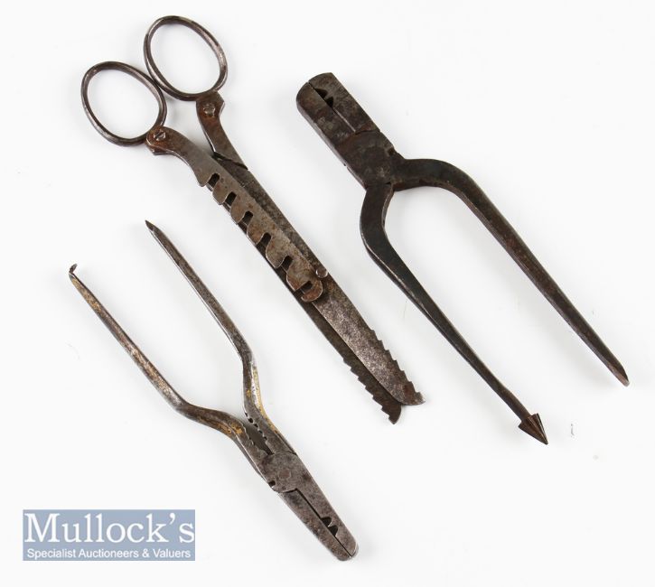 Allcock Pair of Pike Scissors – With adjustable gap setting marked Allcock & Co together with Fishing Gazette pliers stamped Wilson Smith Ltd and another pair marked The Legionanglers pliers all steel reg no 717093 (3)