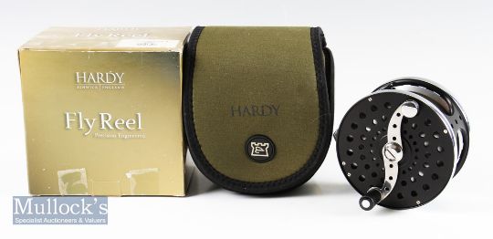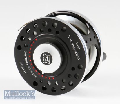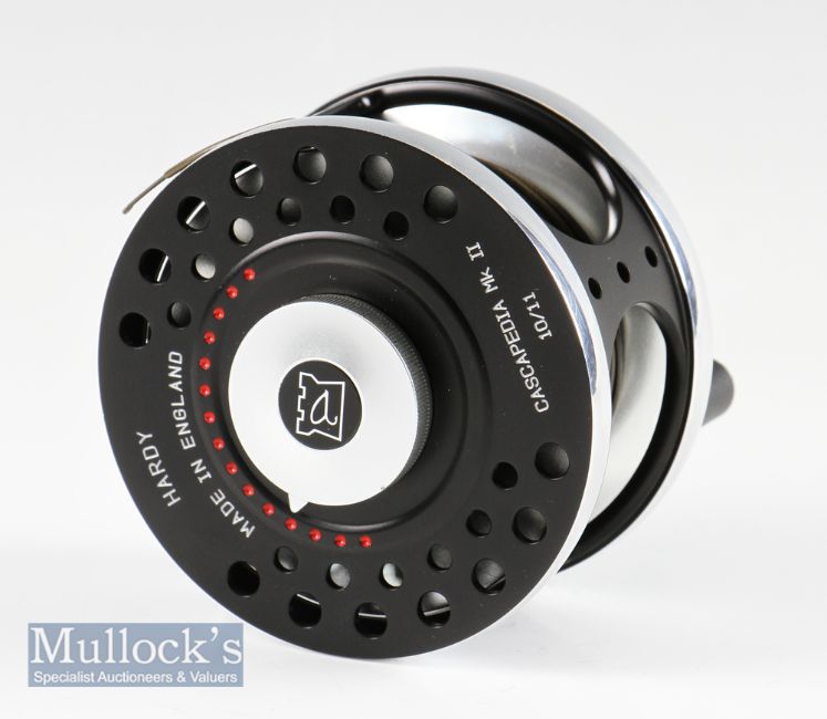 Fine Hardy Cascapedia Mk II salmon fly reel – 4” dia – line 10/11 – ser no A33205 stamped to the smooth alloy foot- c/w Carron fly line – comes in makers neoprene reel case – appears unused