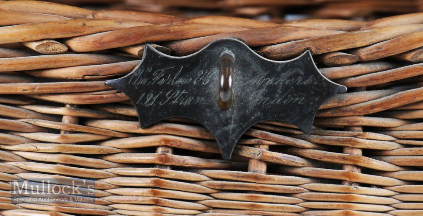 Rare Chas Farlow & Co Makers 191 Strand London large pot bellied wicker creel c. 1890 with original brass hasp engraved with the makers details, original brass hinges, fish slot to lid overall 10.5” x 15” x 8” in remarkably good condition