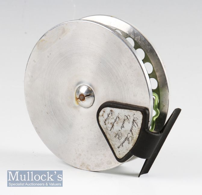 Adcock Stanton Nottingham England centre pin trotting reel – 4.5”dia , twin black handles, knurled front plate rim, with scarce brass engraved makers plate to rear, spins forever in the original makers box.