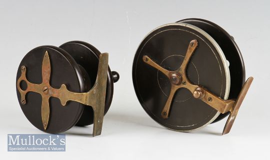 Pair of Ebonite Centrepin Sea Reels – To consist of 4” Twin handled, brass centre screw, star back, pillared centre core, smooth brass foot with unusual brass rim wheel check together with 5” twin handled, centre button drum release, brass and alloy drum core, smooth brass foot, check button, silvered rim (2)