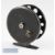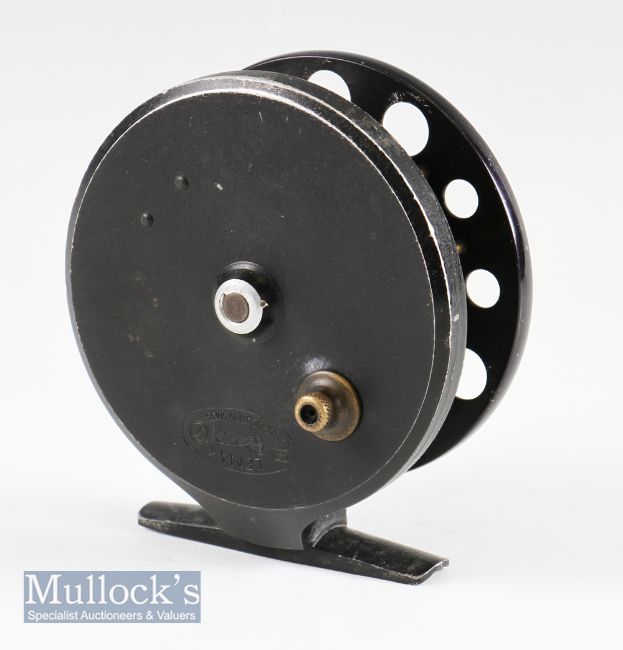 Scarce Lemax Made in Switzerland Aerial alloy centre pin reel - 3.75” diar, ventilated drum, on off brass check button-retaining most of the original black finish spins freely (VG)