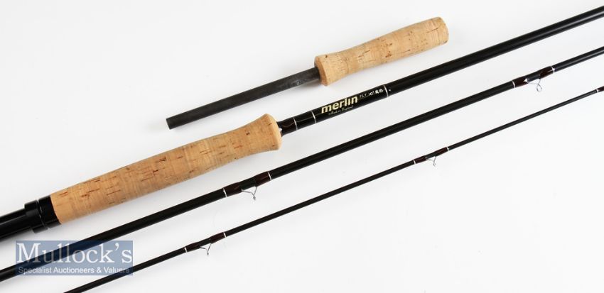 Good Merlin Made in England 10ft 3pc carbon sea trout fly rod with detachable butt extension - line 8# black anodised screw locking reel fittings – lightly soiled handle – otherwise hard to fault – in cloth bad and black cordura rod tube