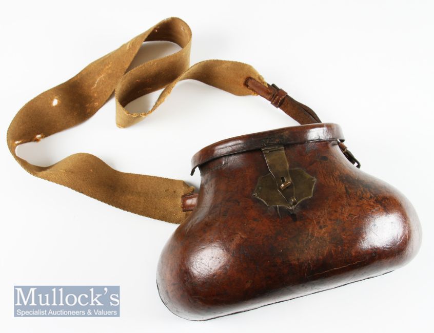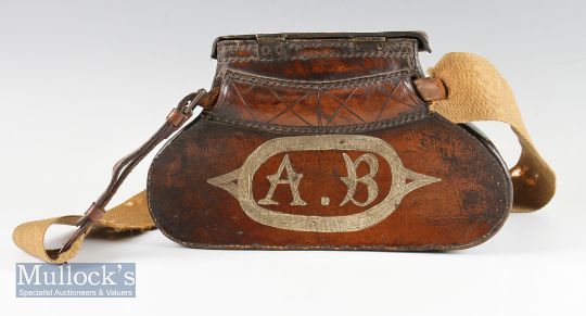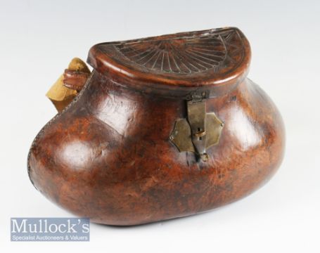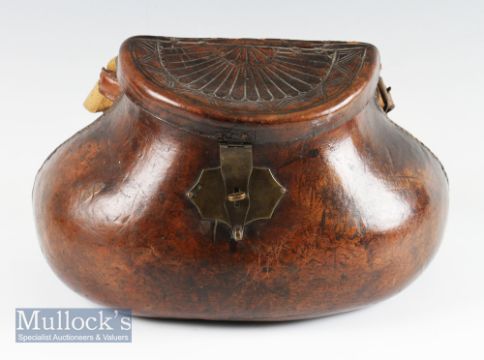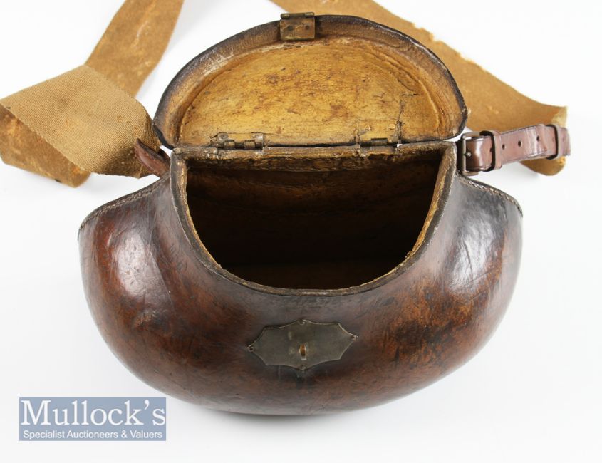 Fine and rare most remarkable 18th Century brown leather pot-bellied fishing creel – 7.5”h x 11.75”w (max) x 5” deep (max) - with hand tooled decorative Sunburst Dial lid, handmade brass hasp with twist/lock button to striker plate, original brass hinges open to reveal cream painted interior, rear leather integral strap holder with large cross hatched markings (fitted with leather and canvas wide shoulder strap), and below hand painted owners initials A.B within an oval border – stunning overall patina and it’s one of those items that definitely raises the hair on the back of your neck – this must be one of the best examples to come onto the market dating back to 1700’s.