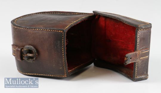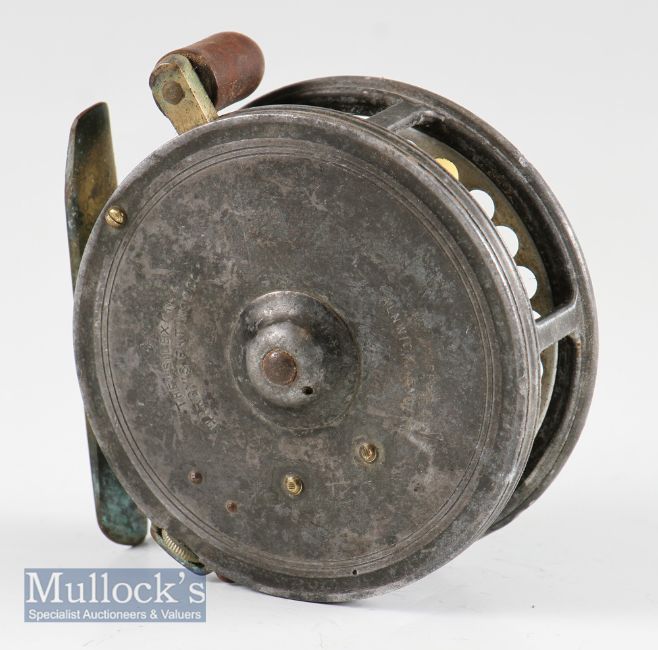 Hardy Bros Alnwick Silex No.2 alloy single handed over casting reel and makers leather case - 3.5” dia, twin ivorine handles, red rubber and brass rim brake lever, alloy/nickle rim tensioner and smooth foot – filed to one end – comes in a period makers block leather D shaped reel case ( strap broken)