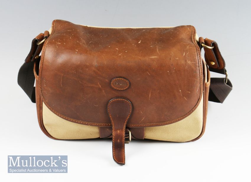 Fine Baron leather and canvas fishing/cartridge/camera utility shoulder bag – c/w side pockets, front pocket and tartan lining, adjustable leather and canvas shoulder strap – overall 8” x 14” x 6”