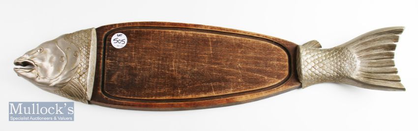 Vintage Salmon Serving Platter – With heavy gauge sculpted aluminium head and fin each end of a wooden tray 35” long