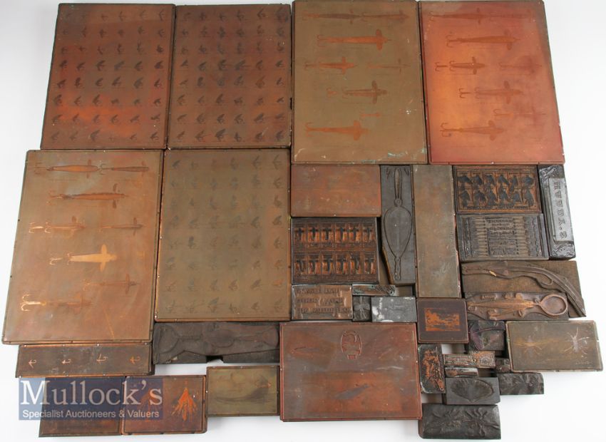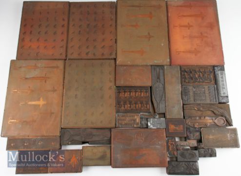 Fishing Related Copper Printing Blocks, Mostly featuring images of Flies and Lures, Spinners of various sizes some may be from Cummins Catalogues (Box)