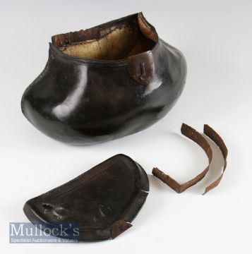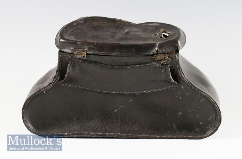 Late 18thc leather pot bellied fly fisherman’s creel - 11.25” x 6” h x 5.5” deep, with decorative tooled lid with small torn area and split to the rim and around the front hinge – although loose it still retains the original hinges, front metal shield shaped hasp plate c/w hinged latch – cream painted interior – c/w hatched cross leather belt strap panel – a few aged leather cracks – nevertheless a very early fisherman creel from around the late 1700s early 1800’s – rare