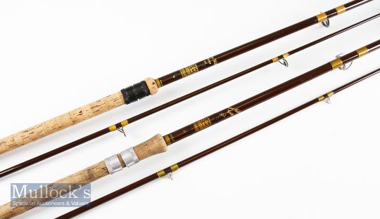 2x Good Hardy Fibalite Richard Walker Carp rods-including Carp No.1 10ft 2p with fully lined guides, 28” mushroom style cork handle (very clean) and very tidy rod in MCB; and a Carp No.2 10ft 2pc with amber lined butt and clear agate tip guides, 28” trumpet style cork handle (very lightly soiled) and a very tidy rod in MCB