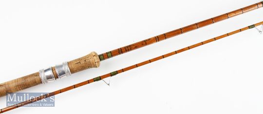 Fine Falcon Redditch England “The Avon” split cane rod -10ft 2pc 2pc with clear Agate lined butt and tip guides- lightly used 25” trumpet style cork handle, appears all original in cloth bag (VG)