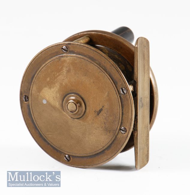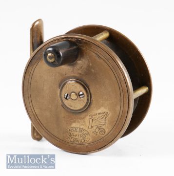 Good Hardy Bros Alnwick Birmingham brass trout fly reel – 2.75” dia with makers Rod in Hand and bordered oval makers logos, constant check, runs freely – good example – c/w leather pokey bag.
