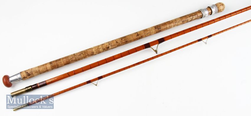 Good B James and Son London England “Kennett Perfection” split cane rod – 11ft 2in 3pc with detachable 24” onion style cork handle (some soiling) - alloy sliding reel fitting rings appears to be all original and comes in fitted cloth bag