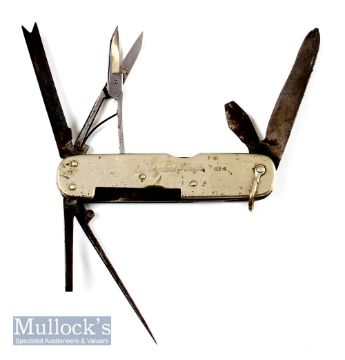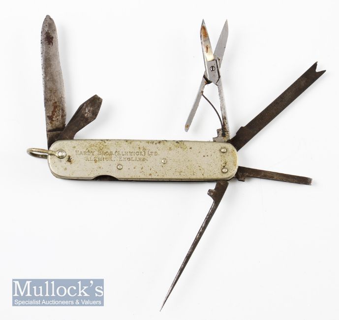 Hardy Anglers knife No.4, correct blades, knife, scissors, spike, bottle / can opener, screwdriver, file maker's address details to reverse of casing, fine (Note blade has been sharpened to misshape and overall rusting)
