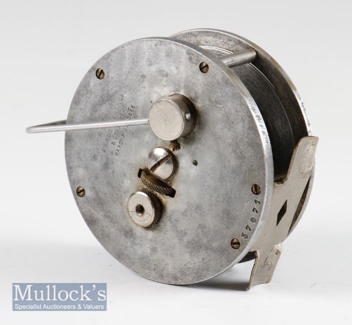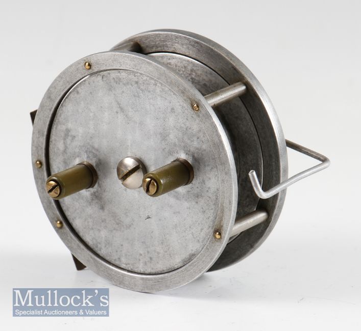 France The Reflex tournament alloy casting reel - 3.5” dia, twin crazed handles, nickel on brass frame pillars, alloy foot, line control lever, adjuster and ratchet to backplate – possibly made by Allcocks of Redditch – stamped with Ser No 37071 to the back plate – spins freely (The Late John Snelson Collection)