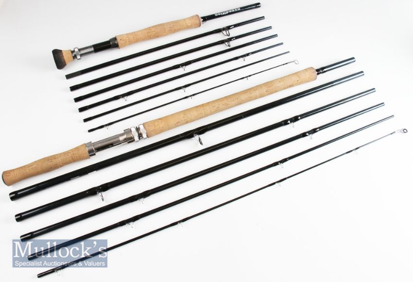 2x Good Shakespeare Expedition Travel Salmon and Sea Trout Fly Rods – 13ft 6pc carbon line 8/9# with Fuji style lined butt and tip guides – lightly soiled handle otherwise appears unused; and 9ft 7pc fast action – line 9/10# - lightly soiled handle otherwise appears unused – both in their makers cordura rod tubes