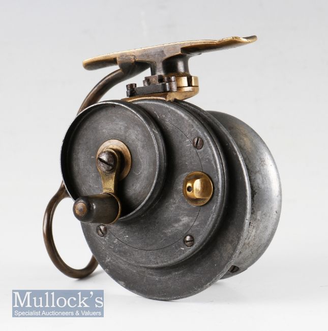 Extremely rare Malloch Patent multiplier side casting reel c.1912/14 – 3.25”dia backplate, raised check housing with ratchet control, horn handle running in anti-foul recessed ring, sliding black horn handle mounted on brass bar to 2 7/8” dia spool, twisting foot mechanism with locking heavy roller V spring - retains most of the original finish – slight knock to the foot – runs smoothly – rare.